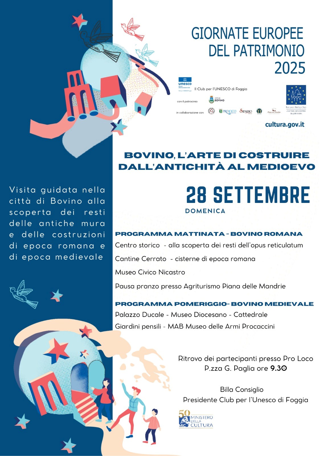 Il nostro club celebra le giornate proponendo una visita guidata nell’elegante cittadina di Bovino antica colonia romana chiamato anche il “Borgo degli ottocento portali di pietra” oggi uno dei Borghi più belli d’Italia e Bandiera arancione del Touring Club . Il tema scelto per l’edizione 2025 “Architetture: l’arte di costruire dall’antichità al medioevo”, sarà esplorato attraverso una passeggiata culturale che guiderà i visitatori alla scoperta dei resti delle antiche mura e delle costruzioni di epoca romana e di epoca medievale, testimonianza della storia e della cultura della comunità bovinese . L’evento realizzato in sinergia con il Comune di Bovino , La Pro Loco, il Museo Diocesano, l’Archeoclub locale, Cantine Cerrato, la Cooperativa Sipario, è stato inserito nel sito del Ministero della Cultura al seguente link :